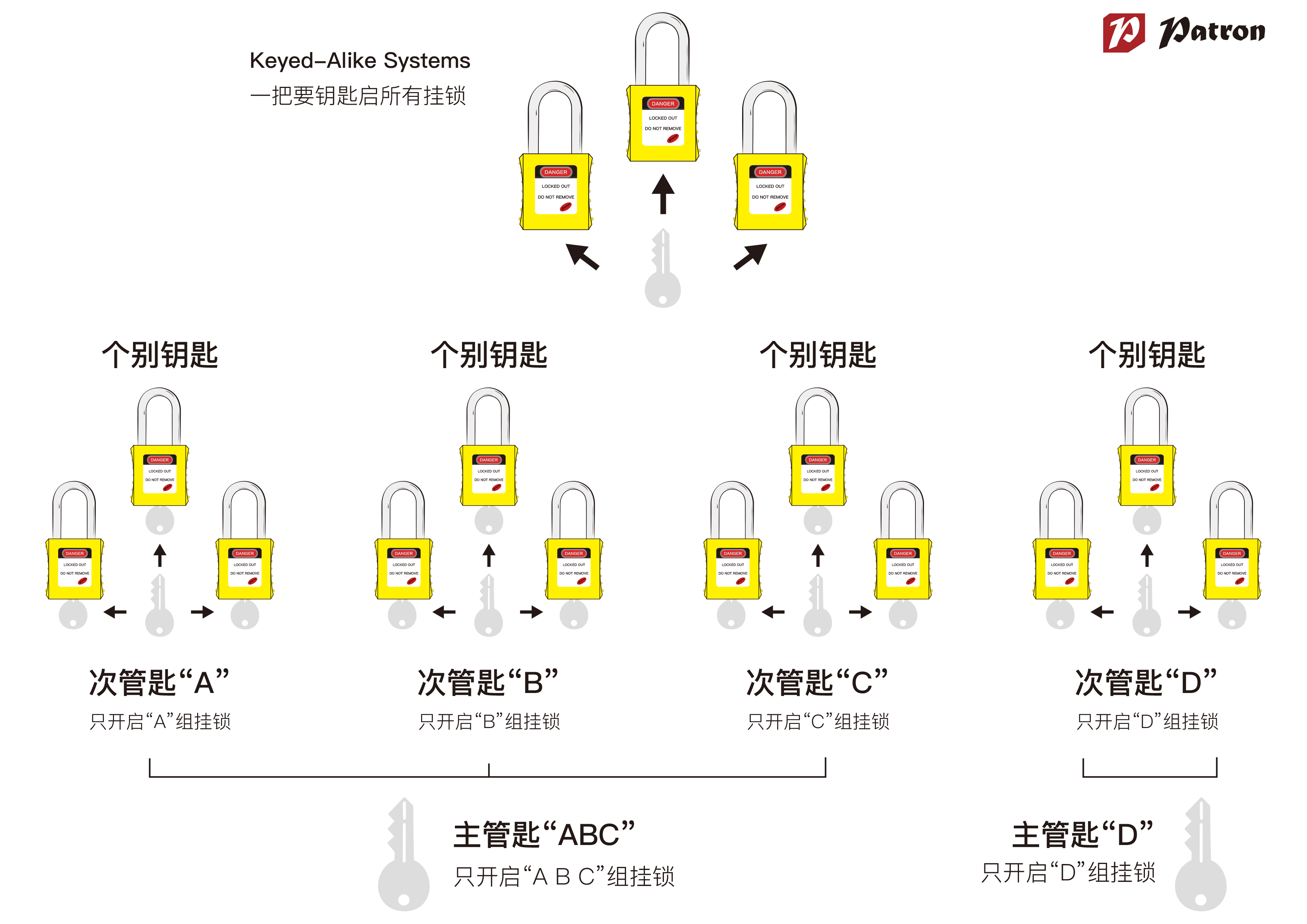 在上鎖掛牌項(xiàng)目中, 使用合適的安全掛鎖鑰匙系統(tǒng)能提升正確的人員在維護(hù)期間使用設(shè)備的管理水平。為此, 鉑鉺盾(Patron)提供一套完善的安全掛鎖鑰匙系統(tǒng), 讓項(xiàng)目參與者事半功倍。