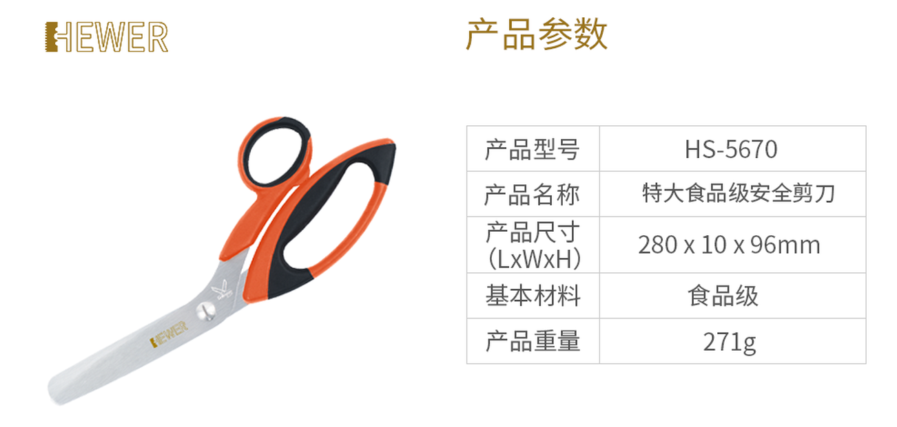 德國熙驊HEWER HS-5670 不銹鋼圓頭不傷手安全剪刀擁有更長的刀刃及更大的手柄,適合剪切更大的食物及各種材料。