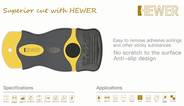 HEWER安全刮刀,既不會刮傷原來的物品,又能輕松去掉黏膠垢以及機器污垢等污漬;這款刮刀還可以輕松去除貼紙以及不干膠,而且還非常安全,不會刮傷自己,非常適合生活或者工作當中使用。
